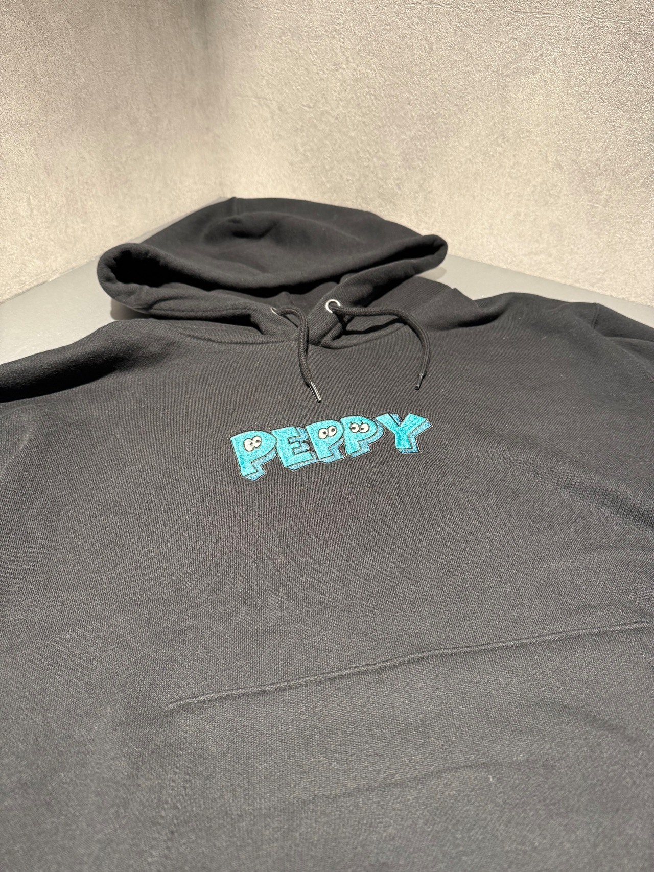 PEPPYのオリジナルロゴを胸元にワンポイントで刺繍した、シンプルなのに存在感のあるフーディ。